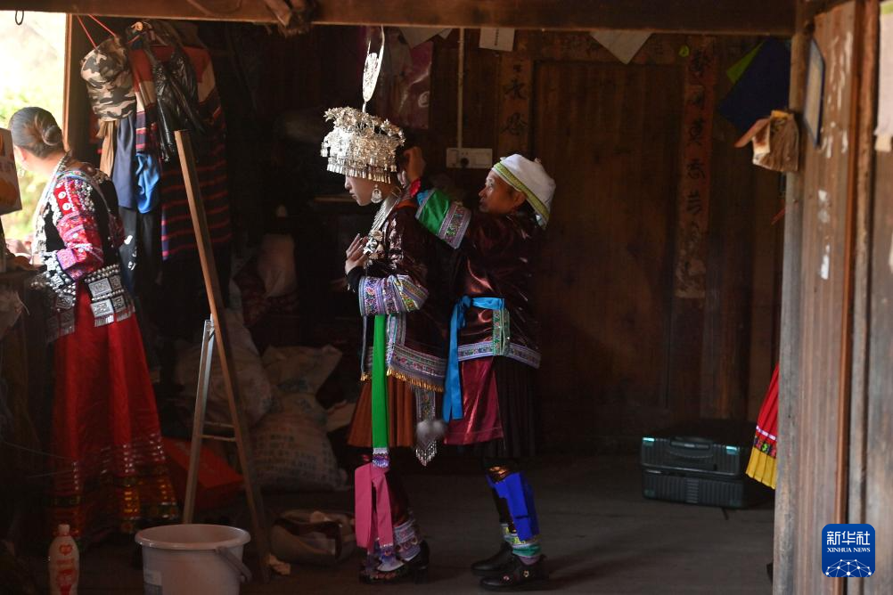 乌英屯村民潘妹兰(右一)为女儿梳妆打扮,准备参加民俗活动(2024年2月12日摄)。