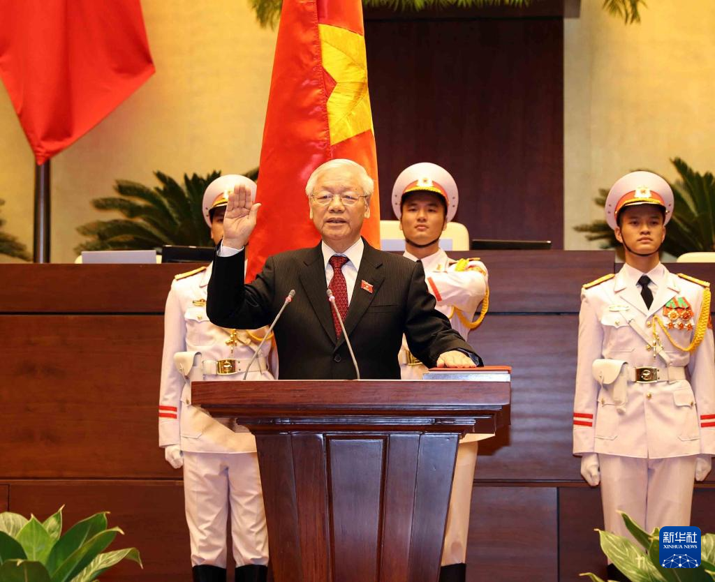 这是2018年10月23日,在越南首都河内,阮富仲(前)当选新一任越南国家主席后宣誓就职的资料照片。新华社/越通社