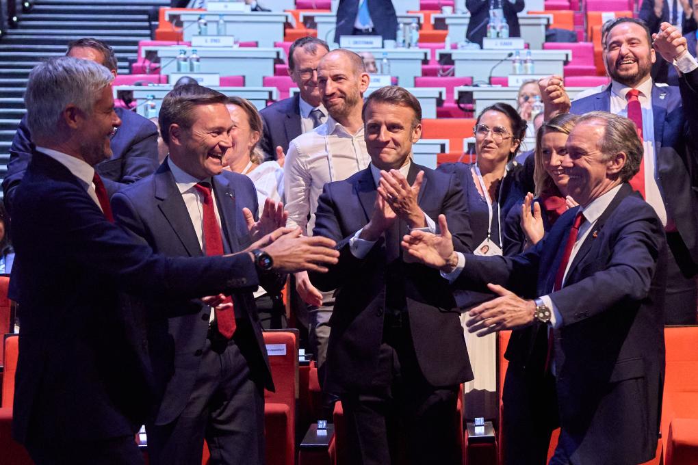 7月24日,法国总统马克龙(前中)与法国代表团成员庆祝阿尔卑斯山地区获得2030年冬奥会举办权。新华社记者 孟鼎博 摄