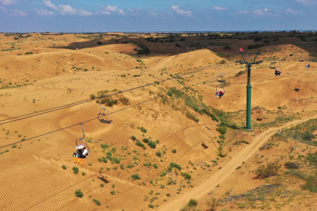 游客在银肯塔拉景区乘坐索道(无人机照片)。