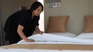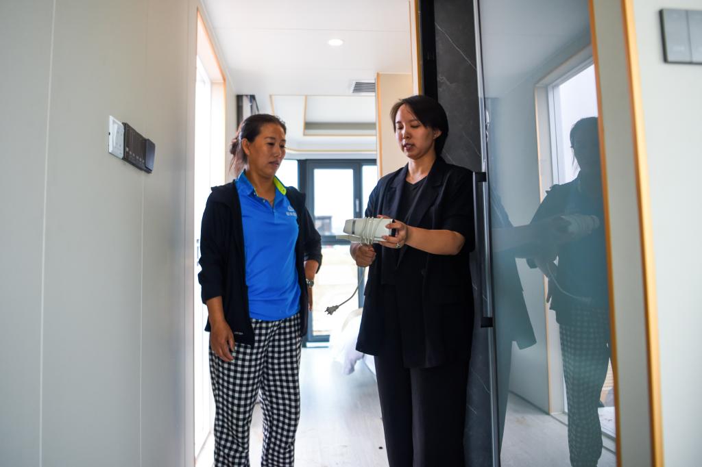 李方(右)在银肯塔拉景区内的沙漠太空舱营地指导员工肖丽丽收纳吹风机。肖丽丽是达拉特旗王爱召镇榆林子村人,目前就业于银肯塔拉景区。