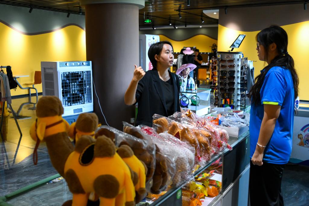 李方(左)在银肯塔拉景区商店与员工交流。