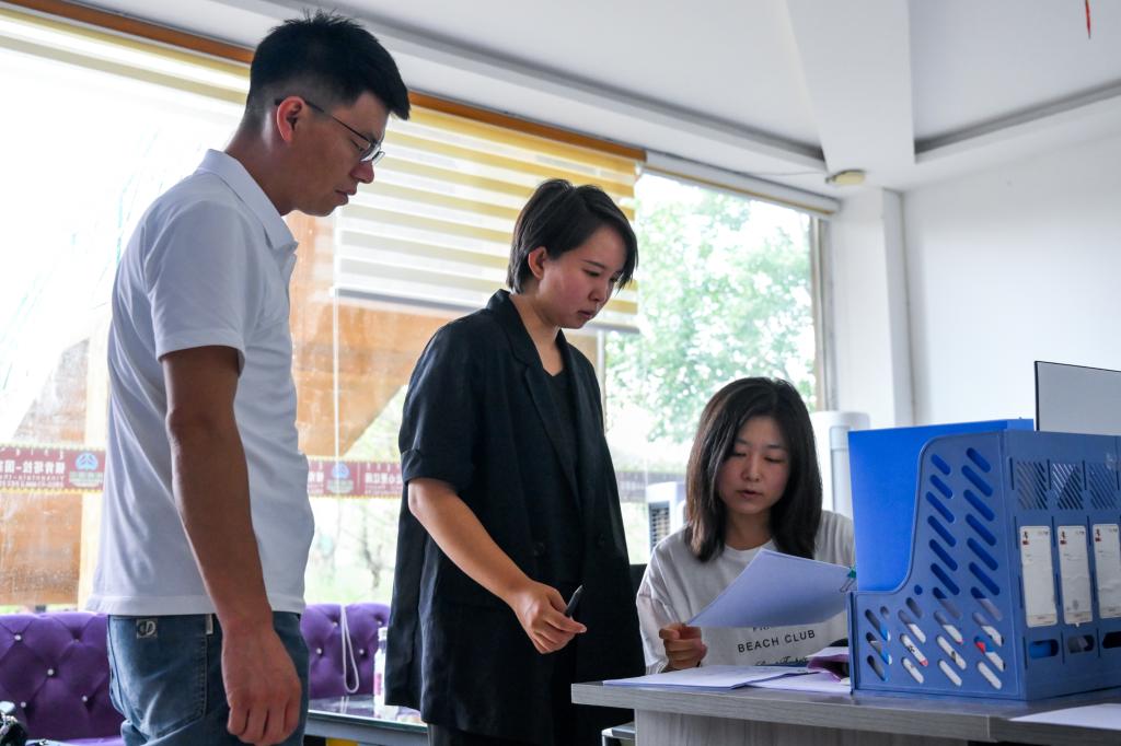 李方(中)在银肯塔拉景区办公室与员工交流。