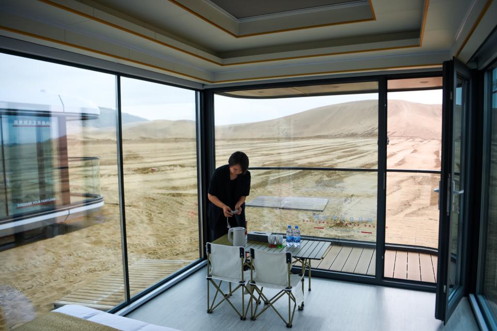 李方在银肯塔拉景区内的沙漠太空舱营地整理房间物品。