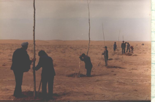 “领导都带头干,王占文书记包的我们奋勇大队,带我们种沙柳。全大队11个生产队,排着队、唱着歌,把红旗插在各自的沙梁上。民兵也领着娃娃们来种树,他们掏坑,娃娃递树栽子。几年下来,把奋勇大队种成了自治区最早的万亩林大队。冯耀华当时是公社副书记,包的是阿鲁柴登,郭巨才当时是公社副主任,包了什里加汗。王占文还专门组织了测绘队,绘出地图,统一规划,给所有农田种上防护林,定下在哪修路种上行道树。20年后按图修路时,施工队发现,路基两旁的树早种好了。”白三宝回忆。