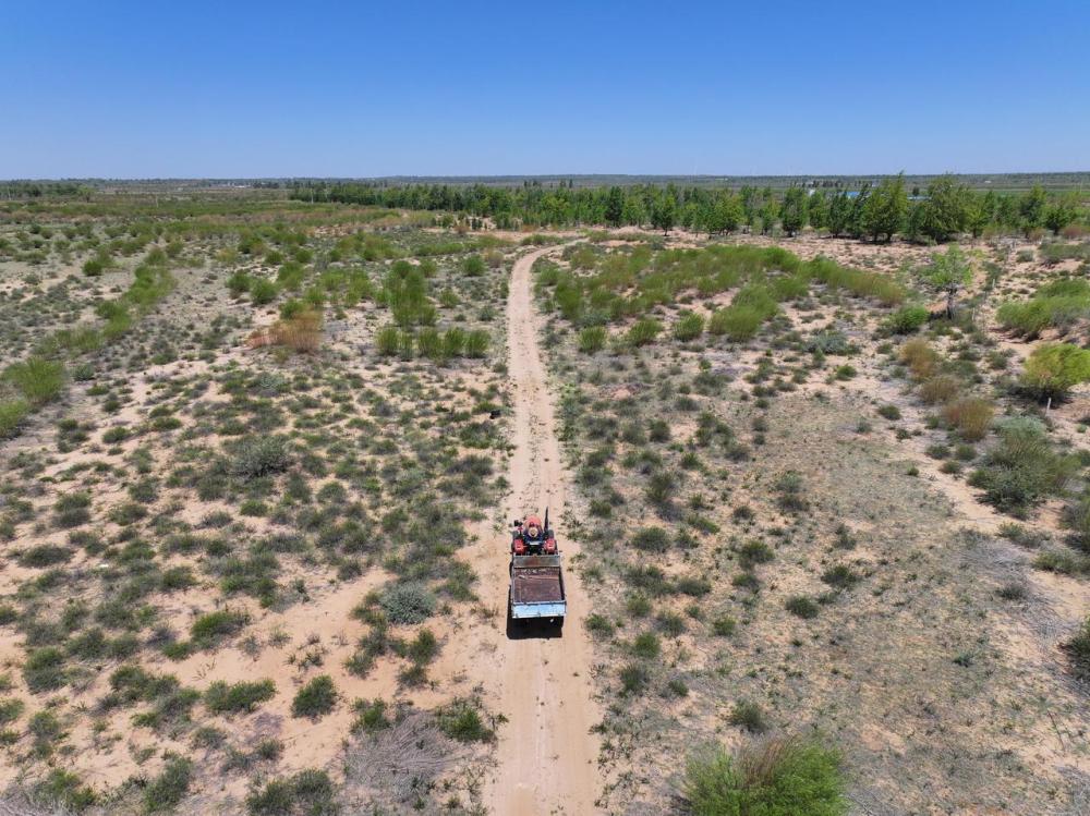 5月30日,张润焕驾驶拖拉机行驶在沙地上,这里经过多年绿化,已是绿意盎然(无人机照片)。新华社记者 连振 摄
