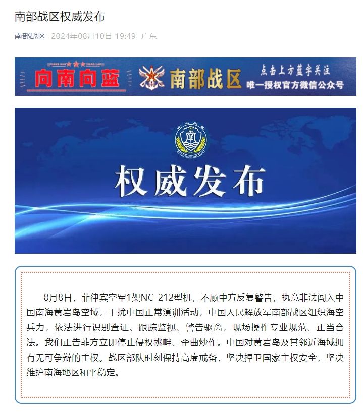 8月8日,菲律宾空军1架NC-212型机,不顾中方反复警告,执意非法闯入中国南海黄岩岛空域,干扰中国正常演训活动,中国人民解放军南部战区组织海空兵力,依法进行识别查证、跟踪监视、警告驱离,现场操作专业规范、正当合法。我们正告菲方立即停止侵权挑衅、歪曲炒作。中国对黄岩岛及其邻近海域拥有无可争辩的主权。战区部队时刻保持高度戒备,坚决捍卫国家主权安全,坚决维护南海地区和平稳定。