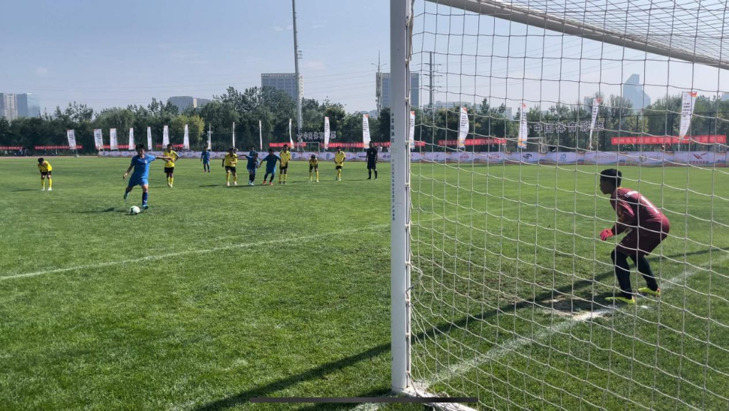 大连理工大学附属学校八年级学生刘铠宁在赛场主罚点球。新华社发