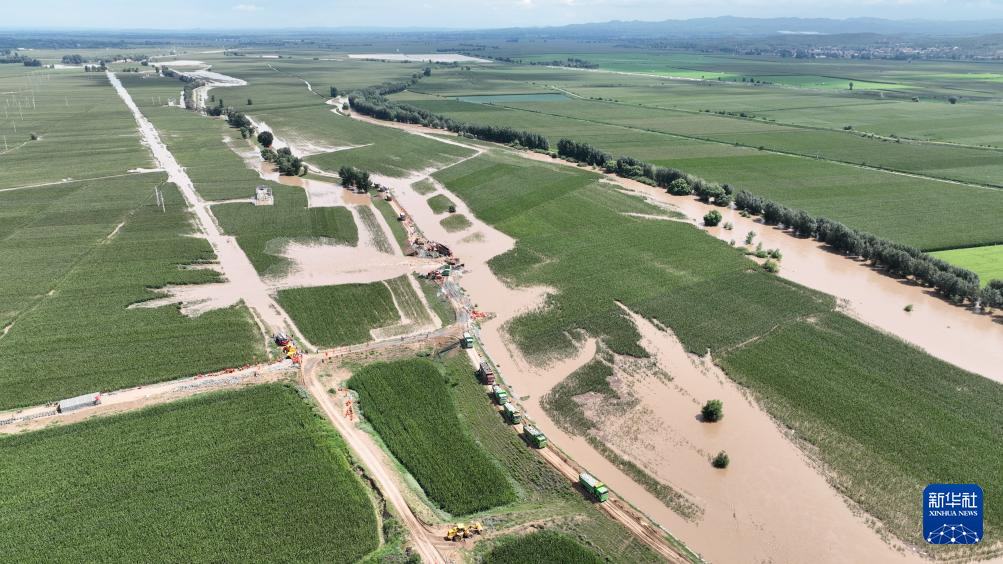 8月14日拍摄的内蒙古赤峰市松山区老哈河堤防溃口抢险现场(无人机照片)。新华社记者 贝赫 摄