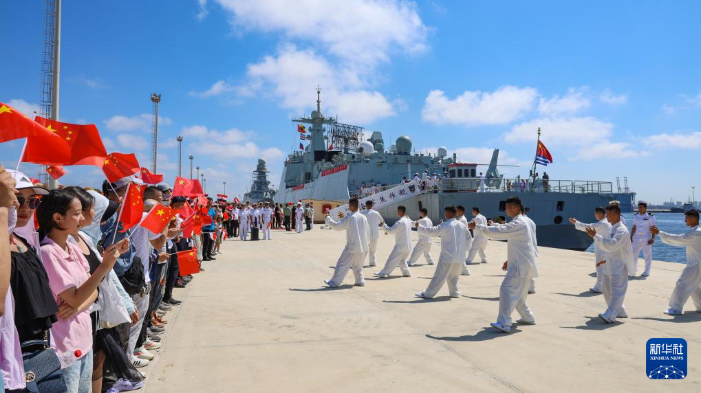 8月15日,中国海军第46批护航编队焦作舰、洪湖舰抵达埃及亚历山大港,焦作舰官兵在码头展示水兵太极拳。新华社发(梁磊摄)