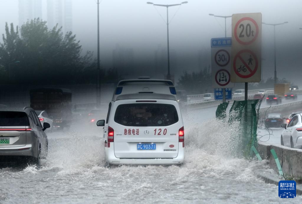 8月26日,在天津市中心城区的快速路上,救护车在雨中前行。新华社记者 李然 摄