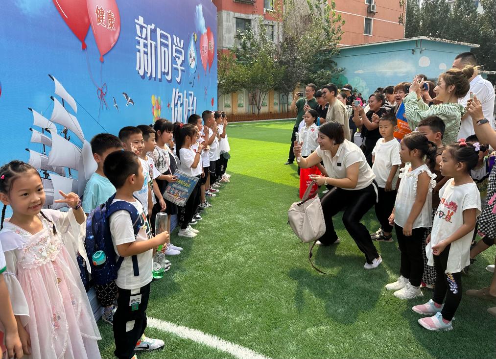 在沈阳市珠江五校教育集团怒江校区,千余名小学一年级新生来校报到。“新同学你好”的巨型展板下,孩子们展露笑脸、拍照留念,准备迈入人生的崭新阶段。