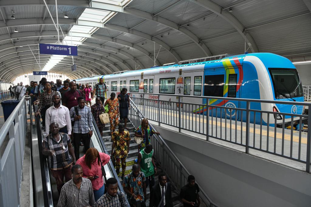 2月28日,在尼日利亚拉各斯,人们在轻轨蓝线码头站下车出站。新华社记者韩旭摄