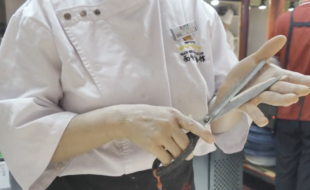 关于剪刀面的故事很动人——“‘剪子面,两头尖,吃到肚里胃不酸’。相传剪刀面是以前乔家大院的乔贵发走西口的时候,留在家里的妻子为丈夫裁剪衣服,由于过于思念丈夫,一走神就把剪刀也带到了厨房里,于是便有了剪子面。‘胃不酸’,其实也是‘心不酸’。”李琨说。剪刀面一般用来做汤面,配蔬菜吃,也有着希望家人安康的寄托。