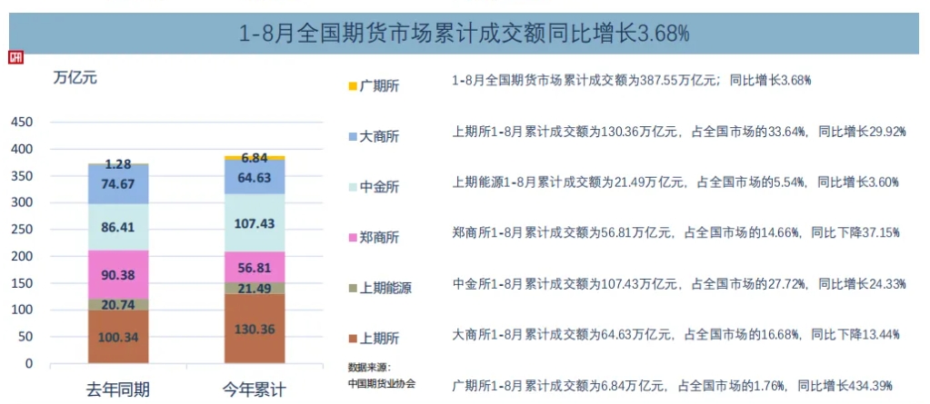从交易所来看,前8个月,上海期货交易所和中国金融期货交易所的成交量、成交额均实现同步增长。上期所累计成交量、成交额同比分别增长2.41%和29.92%,分别占全国市场的28.68%和33.64%;中金所累计成交量、成交额同比分别增长38.08%和24.33%,分别占全国市场的3.04%和27.72%。(记者刘羽佳)