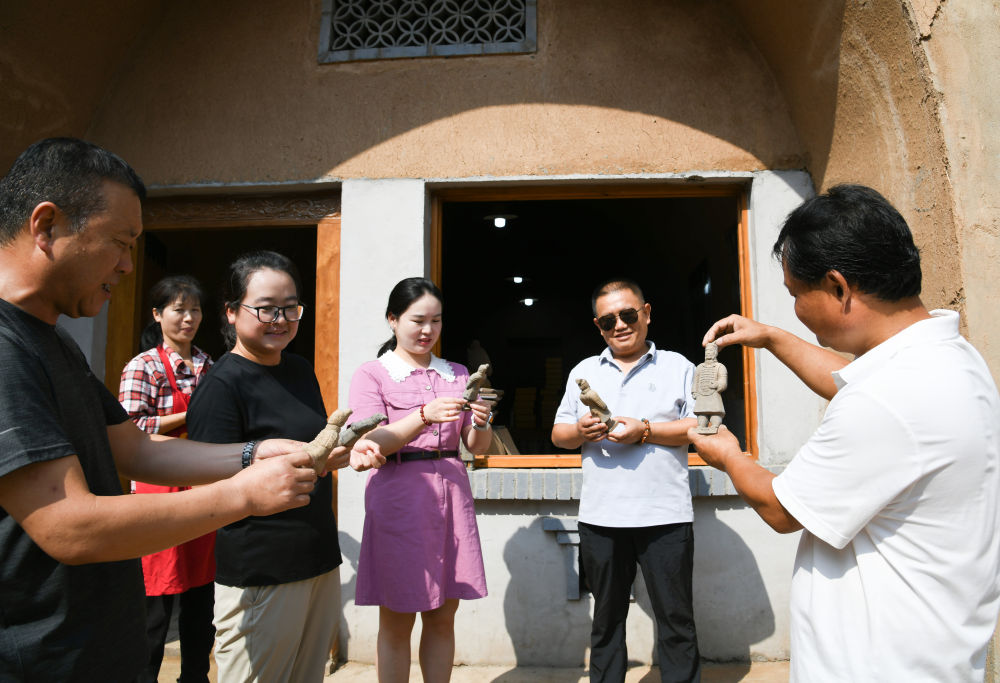 9月4日,游客在西安市临潼区秦俑村欣赏兵马俑工艺品。