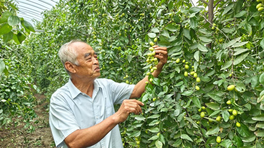 乐陵市林业局推广研究员田敬义正在查看晚熟品种长势。新华社记者 萧海川 摄