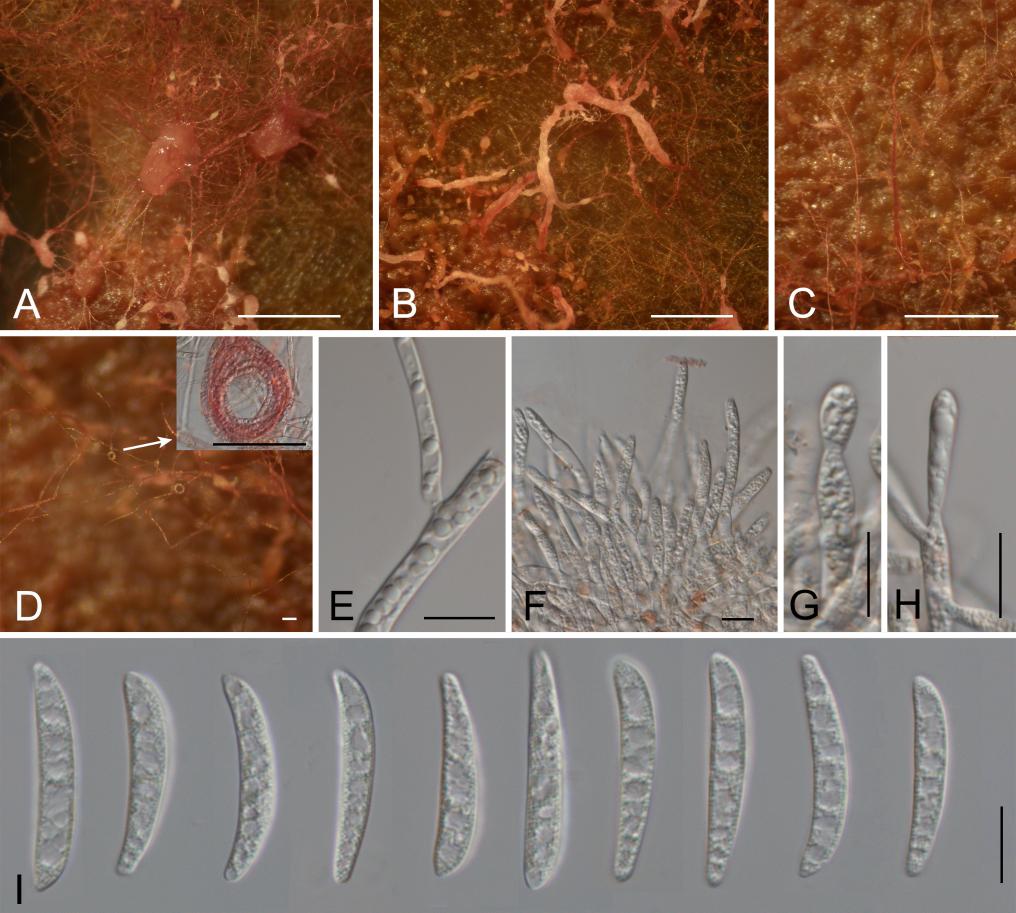 西藏梭孢菌的形态。A、B:PDA上形成的分生孢子团,C:红色的菌丝,D:菌丝结环,E:透明的菌丝,F-H:产孢细胞及初生的分生孢子,I:分生孢子。标尺A-C=500µm;D=50µm;E-I=10µm。(西藏自治区生态环境厅供图)