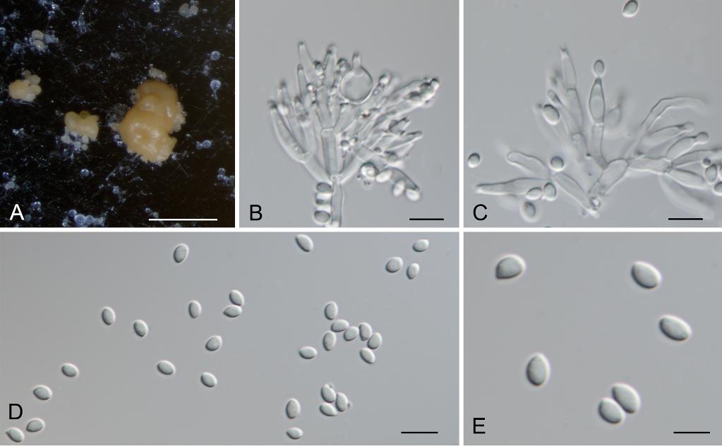 西藏螺旋聚孢霉的形态。A:PDA上形成的分生孢子团,B、C:产孢细胞及初生的分生孢子,D、E:分生孢子。标尺A=300µm;B-E=10µm。(西藏自治区生态环境厅供图)