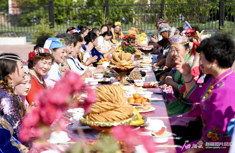 塔城地区塔城市新城街道哈尔墩社区居民在邻里节“百家宴”上品尝美食(2023年5月17日摄)。汤永 摄