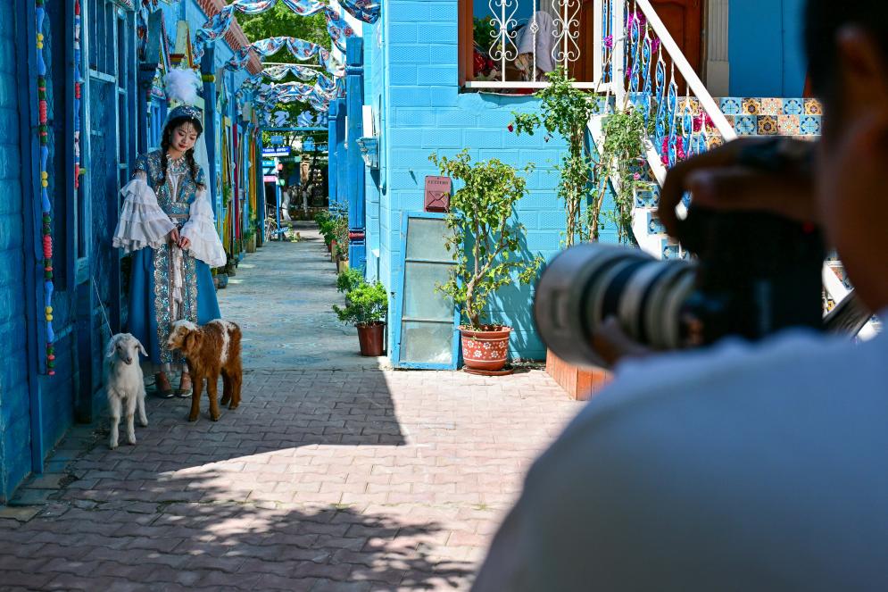在新疆伊犁哈萨克自治州伊宁市六星街,游客体验旅拍项目(7月28日摄)。新华社记者 丁磊 摄