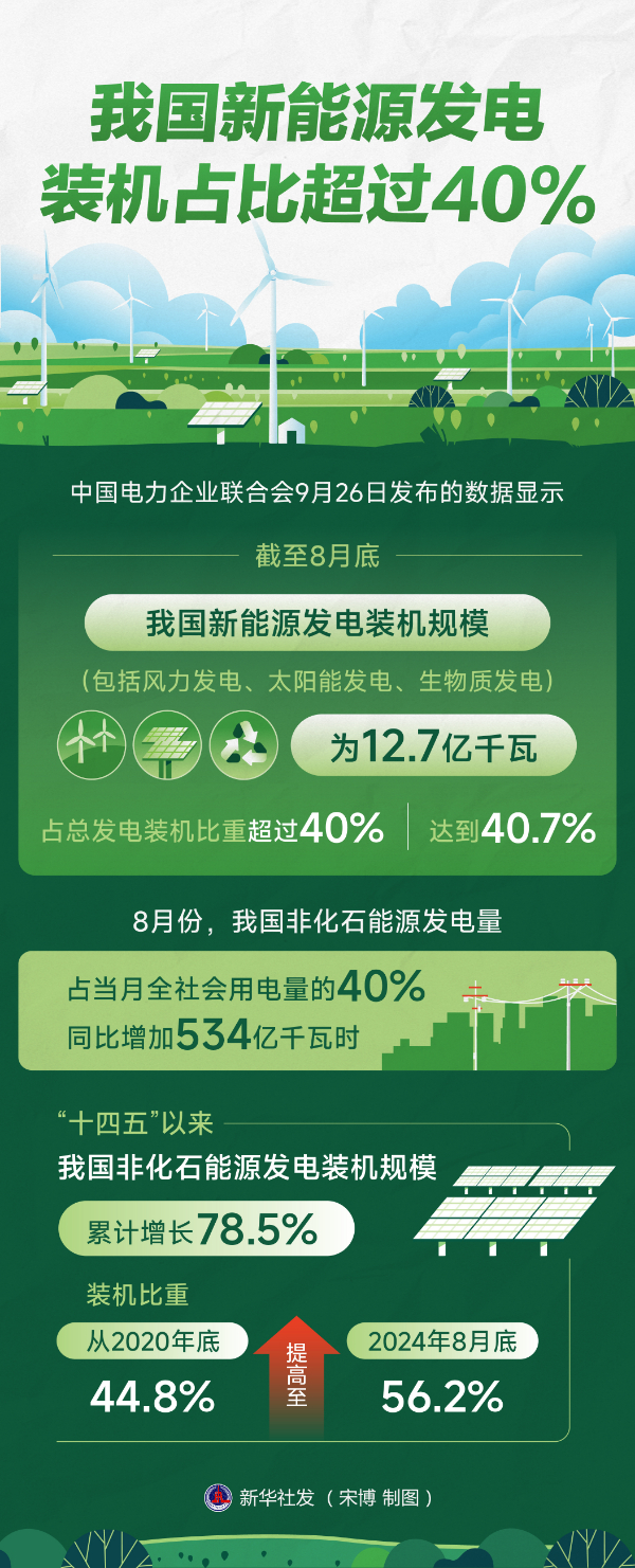 新华社北京9月26日电(记者戴小河)中国电力企业联合会26日发布的数据显示,截至8月底,我国新能源发电装机规模(包括风力发电、太阳能发电、生物质发电)为12.7亿千瓦,占总发电装机比重超过40%,达到40.7%。新能源持续快速发展带动非化石能源发电装机规模及比重持续较快提升,能源电力绿色转型成效显著。
