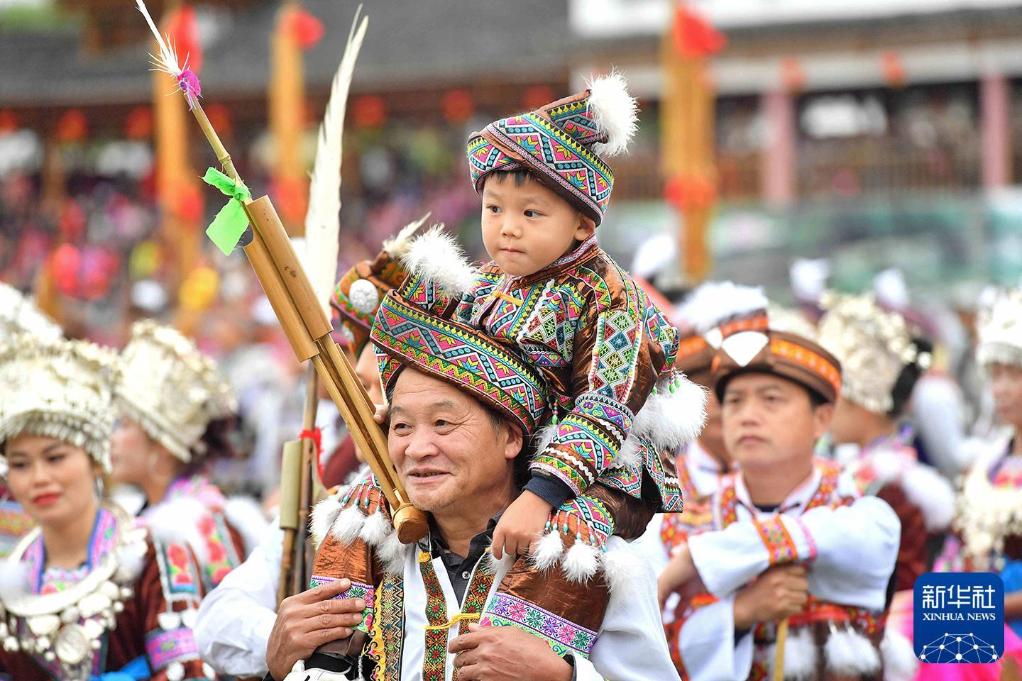 2017年11月18日,在广西融水苗族自治县民族体育公园,63岁的梁玉华带着4岁的孙子梁译文身着民族盛装,参加苗族芦笙斗马节歌舞表演。新华社记者 黄孝邦 摄