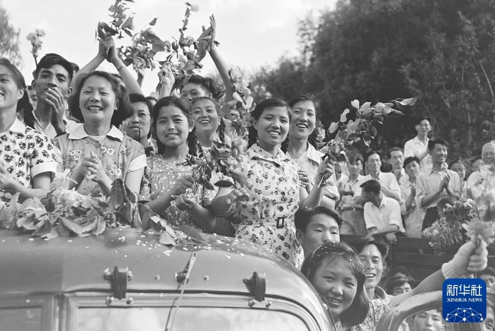 1956年7月14日,身着花裙子和白衬衫的一汽青年职工乘坐解放卡车,欢庆我国第一汽车制造厂建成和试制出一批国产解放牌载重汽车。新华社记者 袁苓 摄
