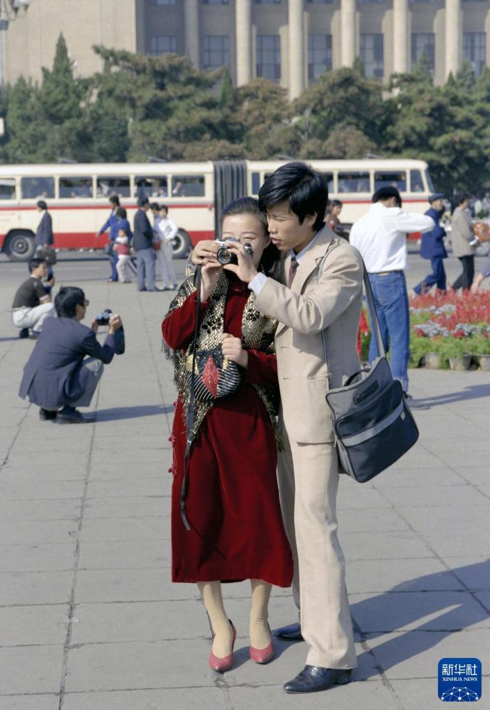 1987年10月1日,一对从外地来北京度假的青年在天安门广场上拍照。新华社记者 薛铁军 摄