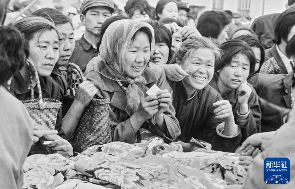 1984年,人们在天津市的农村集市上挑选花布。新华社发