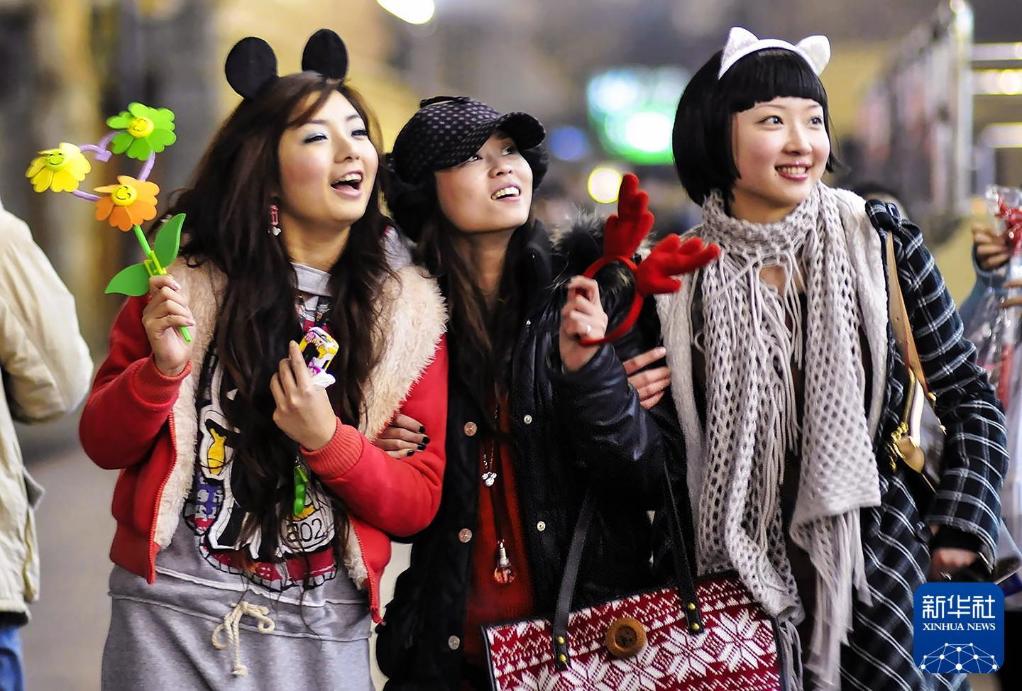 2008年12月,在湖北宜昌街头,三名时尚女孩在逛街。新华社发