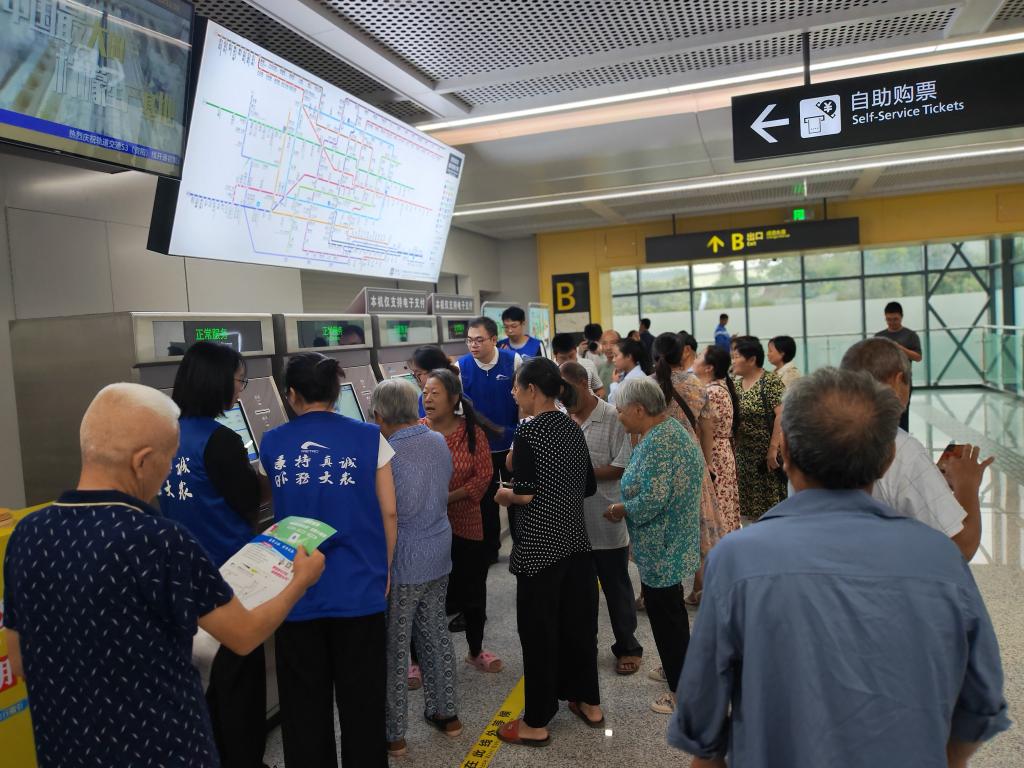 9月29日,在轨道交通资阳线临空站,群众正排队购票,体验坐车。新华社记者 张海磊 摄