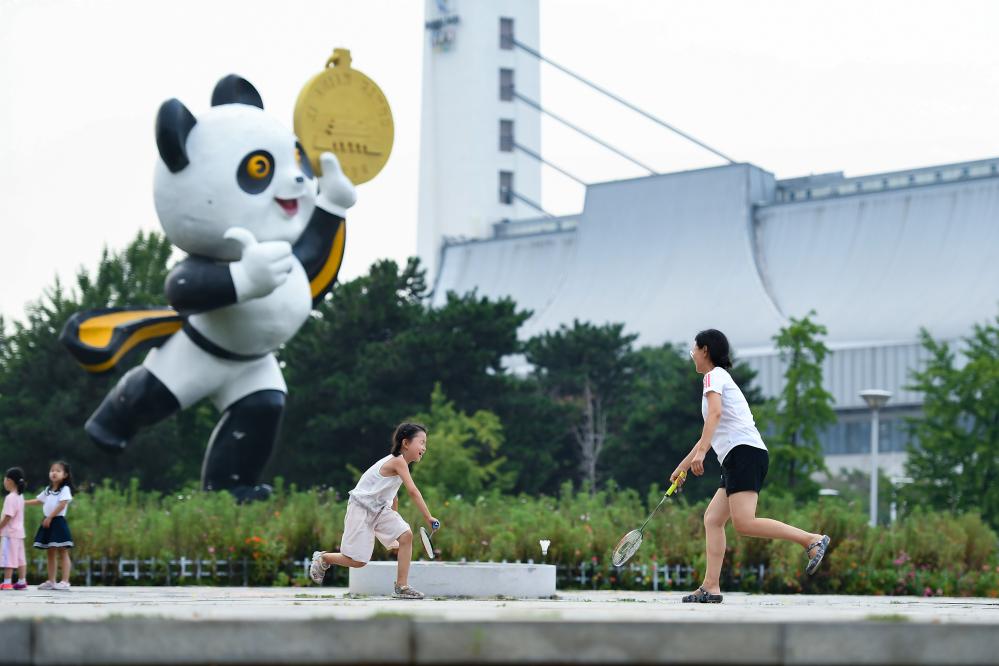 2023年8月20日,市民在位于北京的国家奥林匹克体育中心小广场上打羽毛球。国家奥林匹克体育中心是我国第一个承办大型综合性国际体育赛事的体育场馆群,为1990年北京亚运会而建。新华社记者 陈钟昊 摄