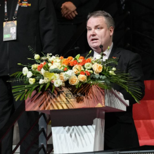 9月29日,史蒂夫·丹顿在2024年世界乒乓球职业大联盟(WTT)中国大满贯赛开幕式上致辞。新华社记者 鞠焕宗 摄