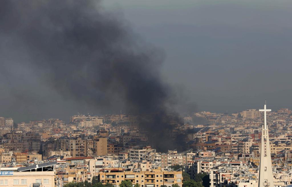 9月28日,在黎巴嫩首都贝鲁特南郊,以军空袭现场浓烟滚滚。新华社发(比拉尔·贾维希摄)