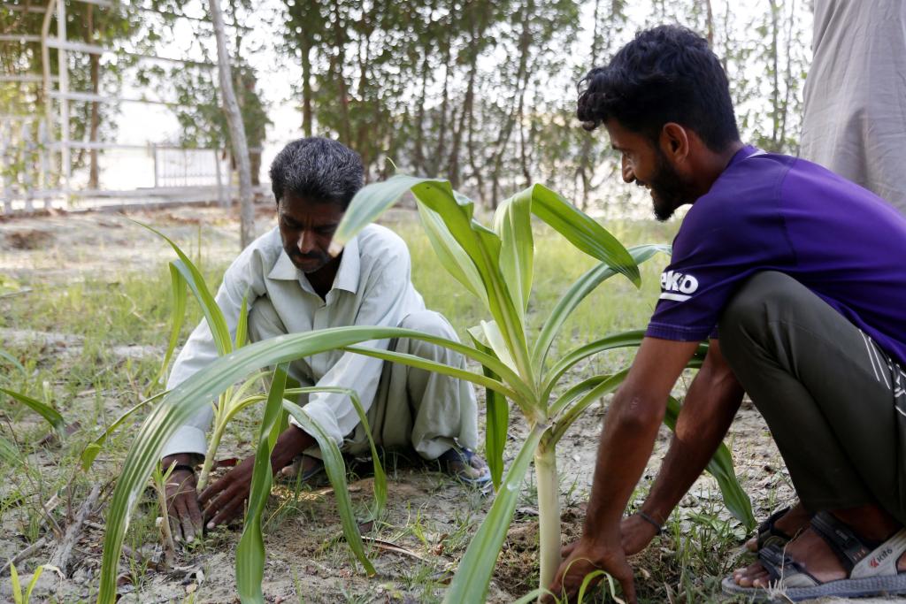 在巴基斯坦瓜达尔,园丁比拉尔·贾韦德(右)与同事在中巴友谊林给植物幼苗培土(9月15日摄)。