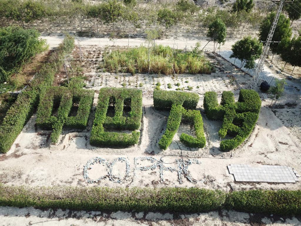 这是在巴基斯坦瓜达尔的中巴友谊林中拍摄的桤果木修剪而成的“中巴万岁”立体字(无人机照片,9月15日摄)。