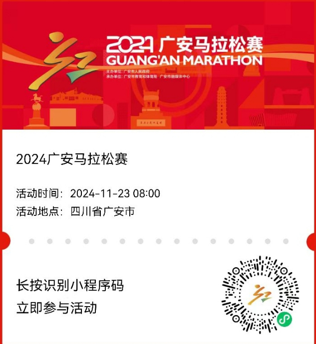 2024广安马拉松由中国田径协会认证,广安市人民政府主办。赛事以“共富思源 奔跑广安”为主题,规模20000人,共设置马拉松(42.195公里)、半程马拉松(21.0975公里)及欢乐跑(5公里)三个竞赛项目。其中,马拉松项目限报3000人,半程马拉松项目限报7000人,欢乐跑项目限报10000人,各项目均报满即止。本届赛事除公开线上报名外,还将邀请全国媒体跑团、企业家跑团、知名人士跑团、川渝高校跑团、社会跑团等组成跑团方阵,为成渝地区双城经济圈建设助阵。