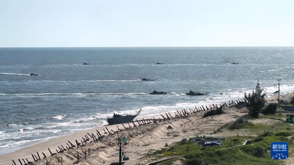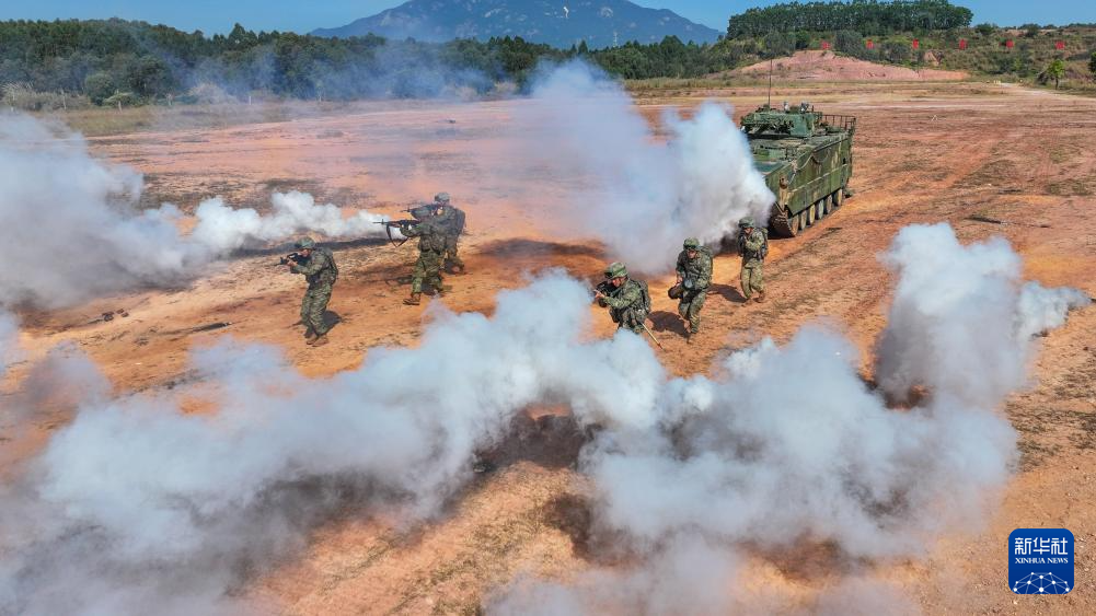 在某海训场,记者看到数辆铁甲战车劈波斩浪,官兵们全副武装奔向目标区域,一场合成战术演习拉开序幕。