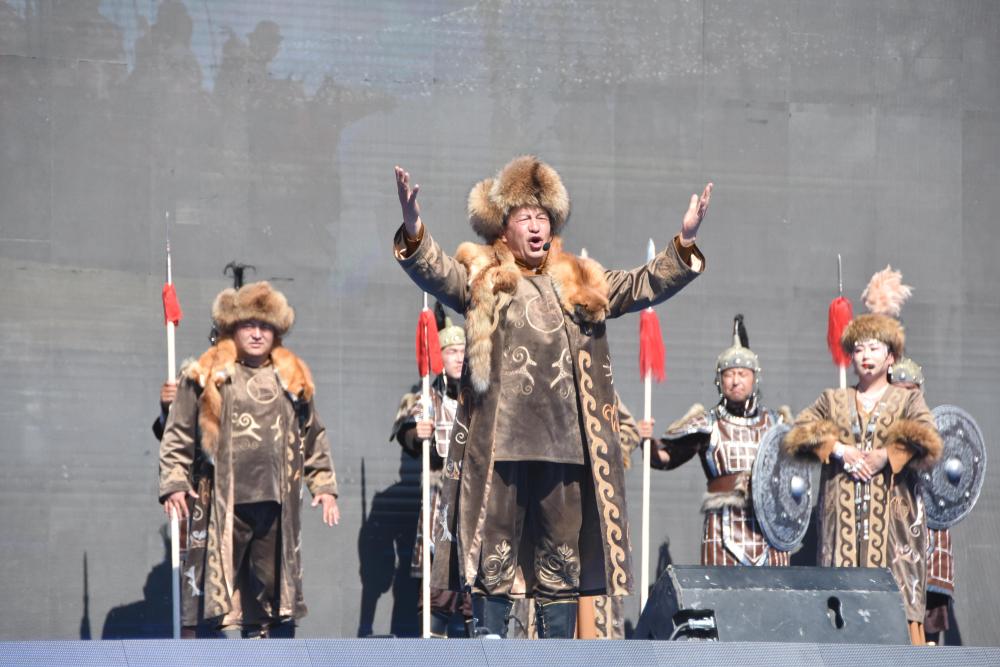2023年7月13日,在新疆克孜勒苏柯尔克孜自治州乌恰县,歌舞演员在第九届玛纳斯国际文化旅游节开幕式上表演《玛纳斯》片段。新华社记者 张瑜 摄