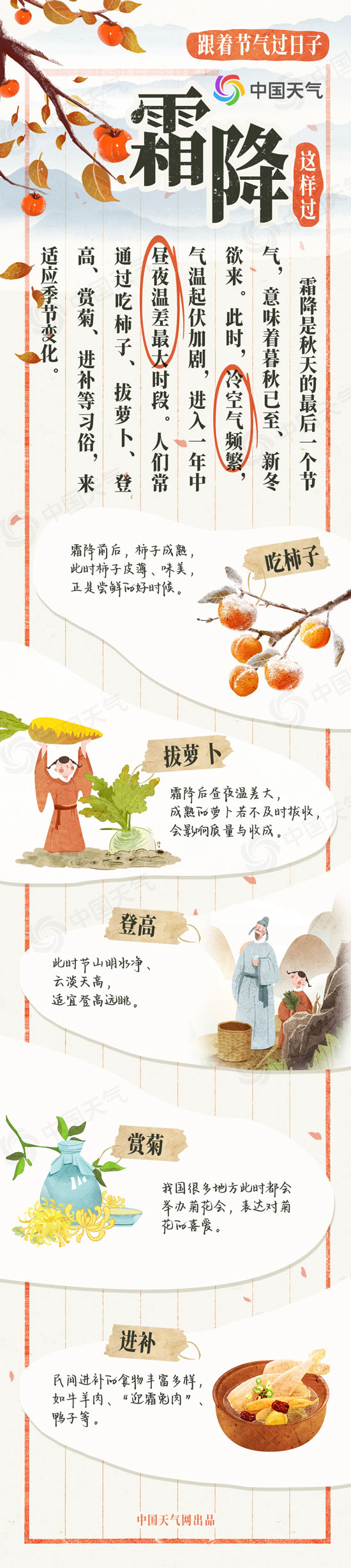 春生夏长,秋收冬藏,跟着节气过日子。今天(10月23日)进入秋天的最后一个节气——霜降,意味着暮秋已至、新冬欲来。此时,冷空气频繁,气温起伏加剧,进入一年中昼夜温差最大时段。人们常通过吃柿子、拔萝卜、登高、赏菊、进补等习俗,来适应季节变化。中国天气网特别推出霜降风俗图鉴和霜降全国天气地图,看看这个节气怎么过。