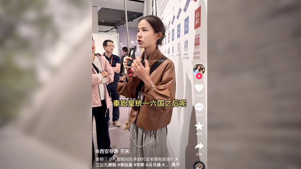 芥末的本名叫王钰,她今年26岁,是个地道的西安女孩。这位年轻的西安导游以专业的知识储备、独特的讲述方式和对历史文化深沉的热爱,吸引了观众的目光,为古老的兵马俑赋予了新的生命力。目前,她的抖音账号粉丝已超过440万。有网友戏称她是兵马俑的互联网“嘴替”,称赞她把兵马俑讲“活”了。