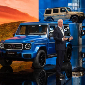 2024年4月25日,在北京中国国际展览中心顺义馆举行的2024北京车展上,梅赛德斯—奔驰集团股份公司董事会成员唐仕凯介绍梅赛德斯—奔驰纯电G级越野车。新华社记者才扬摄