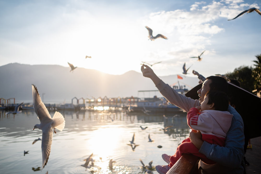 市民在云南滇池畔投喂红嘴鸥(2022年10月20日摄)。新华社记者 王冠森 摄
