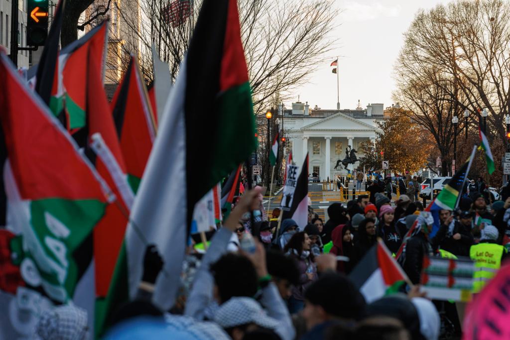 1月13日,在美国首都华盛顿,人们参加声援巴勒斯坦的集会游行活动。新华社发(亚伦摄)