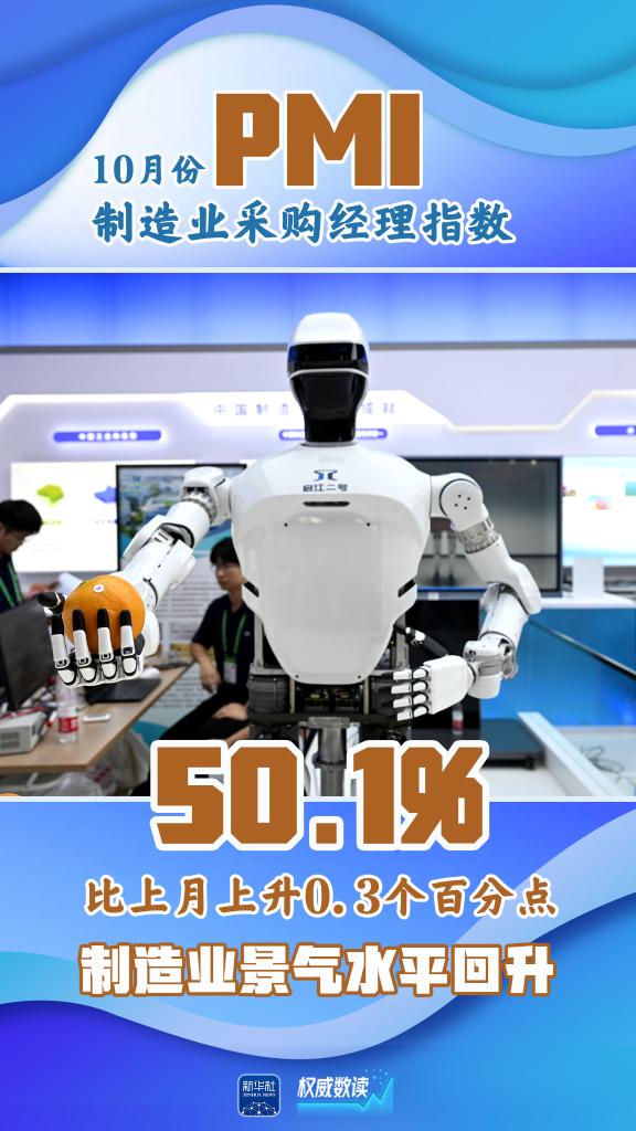国家统计局服务业调查中心、中国物流与采购联合会10月31日发布数据,10月份,中国制造业采购经理指数(PMI)为50.1%,比上月上升0.3个百分点,制造业景气水平回升。