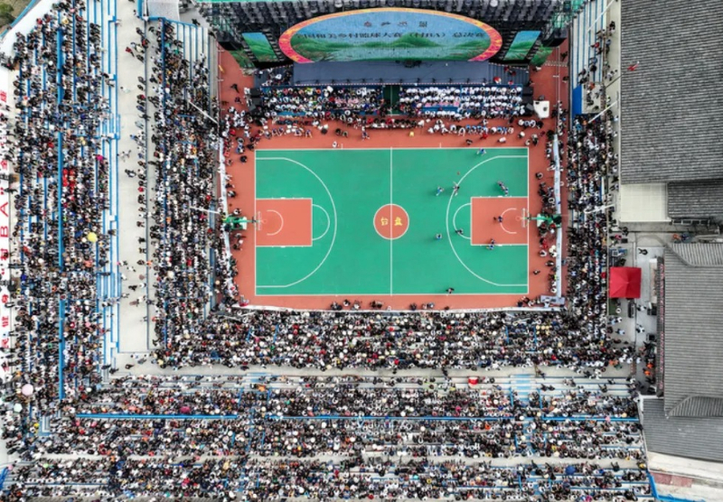 从空中俯瞰,夜幕下的台盘村篮球场就像是一颗璀璨夺目的绿宝石,光芒所到之处,一派繁荣景象。这不禁令人感慨,一个篮球正在从方方面面改变一座县城,乡村体育的多元功能正在显现。