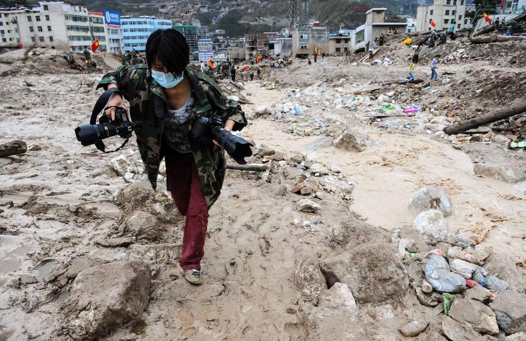 2010年8月14日,新华社记者刘潇在甘肃舟曲特大泥石流灾害现场采访。