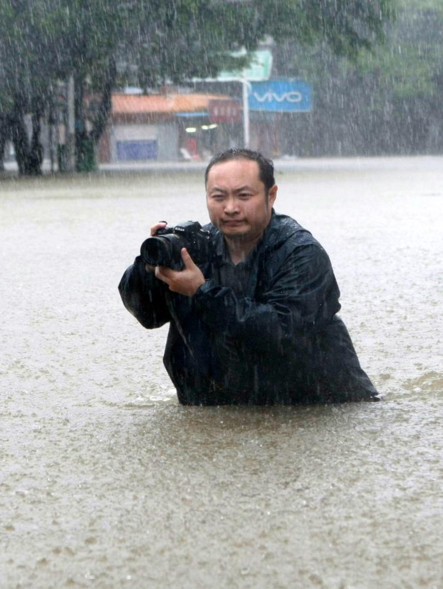 周科:“我一路追‘风’,从广东茂名追到阳春市,刚进市区,车辆就被几条街道猛涨的洪水阻挡。身着雨衣、举着雨伞,完全抵挡不住狂风暴雨,我索性扔掉雨伞,用相机记录雨水中的行人、被水浸泡的街道和门店。在漠阳江二桥上,我看到,江水水位已经远远超过江岸,淹没了两岸的步道,两侧的桥头也已经被淹没,普通车辆完全无法通行。在被困桥上3个小时之后,天色渐黑,我只能选择弃车而去,乘坐救援队的冲锋舟回到地势相对较高的府前路。”