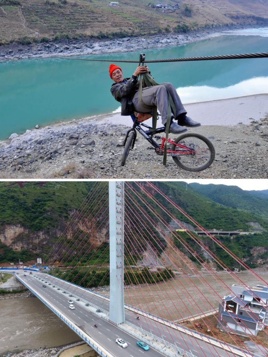 拼版照片,上图为2013年2月2日,在怒江傈僳族自治州泸水县六库镇双米地村辣子咪村民小组,一名傈僳族男子带着自行车溜索过怒江(新华社记者蔺以光摄)。下图为2016年9月9日拍摄的怒江傈僳族自治州的双向六车道大型公路跨江桥梁——通达桥(新华社记者胡超摄)。